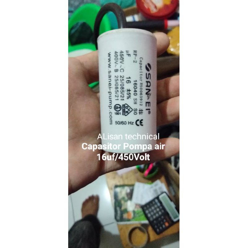 kapasitor Pompa air jet Pump16uf/450voltbisa jg untuk peralatan dinamo lain nya yg ukuran mkironya samaPRODUK ASLI ORIGINAL