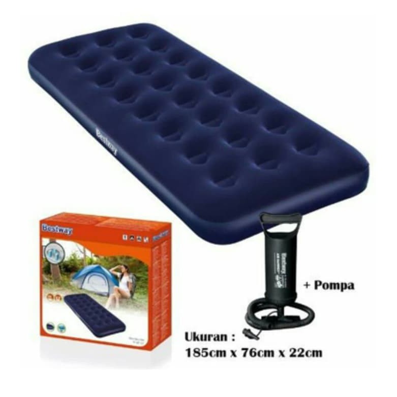Kasur Angin Bestway - Single + Pompa 12"* Dimensi : 185 x 76 x 22 cm* Bahan PVC vinil dengan lapisan bludru pada bagian atasnya* Material bahan kuat* Lembut, nyaman & praktis.* Cocok untuk traveling* kapasitas 150kgMemberikan Manfaat LebihKasur angin bestway sudah terbukti sangat bermanfaat bagi banyak penggunanya, untuk mengganti kasur yang lama, untuk yang suka bepergian jauh/ traveliing/ berkemah, untuk persiapan dirumah jika banyak tamu menginap, untuk yang tinggal di kos, juga banyak digunakan untuk extra bed hotel hingga tidak perlu mengeluarkan biaya lebih, dll.Note : Semua barang yang dipompa tidak ada garansi kebo