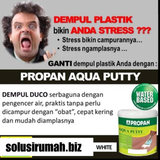 PROPAN MULTIPURPOSE AQUA PUTTY adalah dempul 'duco' 3in1 dengan pengencer air yg praktis dan serbaguna,dapat digunakan sebagai :1.dempul pengisi lubang kayu2.dempul pembentuk lapisan atau 'body filler'3.lapisan antara atau undercoatSaat ini,dempul plastik yang biasa digunakan untuk dempul mobil,digunakan juga sebagai dempul duco utk mebel/kayu. Dempul plastik adalah dempul 2 komponen dengan perbandingan campuran 100:2Perbandingan 100:2 ini cukup sulit sehingga kekerasan dempul menjadi tidak stabil/bahkan tdk kering sama sekali. Setelah 1-2jam dempul plastik ini sdh kering, tetapi ngamplasnya sangat sulit walaupun sdh dibantu dgn air sehingga memakan waktu ckp lama. Bau dari dempul plastik ini juga sangat menyengat.Berbeda dgn dempul plastik, MULTIPURPOSE AQUA PUTTY adalah dempul dgn pengencer air yg tdk berbau dan sangat praktis krn tdk perlu dicampur 'obat' lagi. Cepat kering karena 30menit sdh bs diamplas dgn mudah sehingga proses pendempulan menjadi lbh cepat. Video cara aplikasi lihat di youtube,cari dgn keyword aqua put