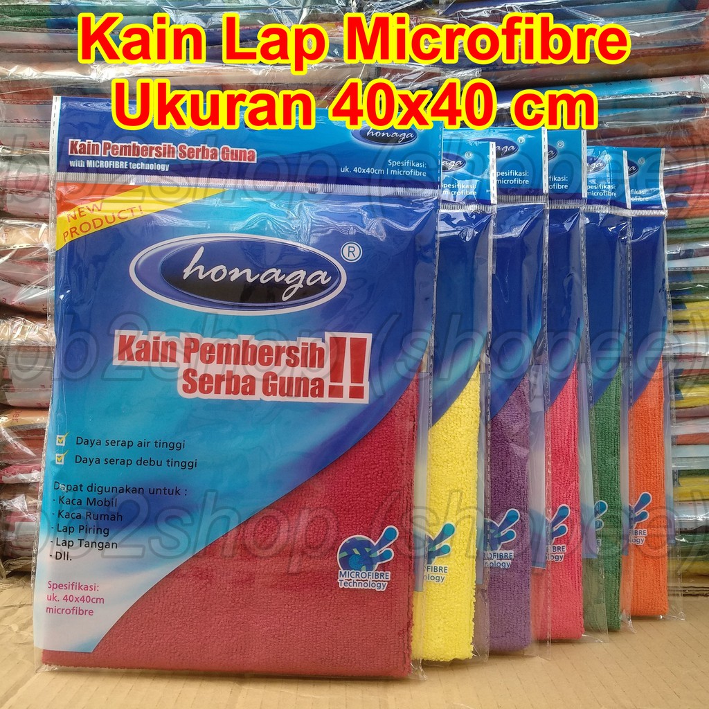 PILIHAN WARNA:Merah Hati, Kuning, Ungu, Biru, Hijau Tua, Orangepembelian diatas 3 pcs, warna tidak bisa pilih ya ...DESKRIPSI PRODUK:> MERK : Honaga (merk terdaftar & teruji kualitasnya)> KEMASAN : Plastik dengan sablon full colour yg dilengkapi hanger untuk display.> BAHAN : Benang (80% polyester / 20% polyamide) yg halus & lembut.> UKURAN : 40 x 40 cm> BERAT : 50-52 gram / pcs> TYPE : 320 GSMGARANSI ukuran dan berat sesuai gambar dan keterangan.Karena berat menentukan ketebalan dan kepadatan sulaman benang.KAIN LAP SERBAGUNA untuk :> KENDARAAN : Mobil, Motor.> DAPUR : Gelas, Piring, Meja makan, Kompor, Serbet/Lap tangan, Kitchen set, dll.> RUMAH TANGGA : Mengepel lantai, Mengelap jendela kaca, TV, Computer, Laptop, Kulkas, Mesin cuci, dll.> HANDUK : Mengeringkan badan setelah mandi, Mengeringkan rambut setelah keramas, Mengelap keringat saat olah raga. Sangat cocok untuk handuk bepergian, ukurannya tidak selebar handuk dirumah tapi dapat mengeringkan seluruh badan.> SALON : Membantu proses pengeringan rambut dengan cepat setelah keramas tanpa harus menggunakan hair drayer yang dapat merusak rambut.KELEBIHAN Kain lap ini :> Daya serap air yg sangat tinggi & mengangkat debu tinggi.> Tidak kering/kaku walau lama tidak digunakan/tidak kena air.> Tidak menggores media/benda yang dilap.> Tidak meninggalkan bulu2 halus pada permukaan yg dibersihkan.produk sesuai gambarproduk readysilahkan langsung diorder aja ya ... *^.^*kain lap microfiber honaga yg lebih tebal bisa kesini : https://shopee.co.id/microfiber-honaga-premium-original-380gsm-lap-mikrofiber-mobil-motor-micro-fiber-berkualitas-top-i.17347844.28444