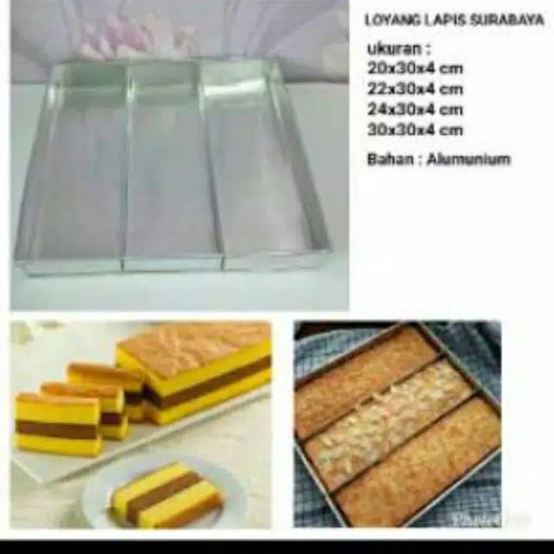 Loyang lapis surabaya berbahan alumunium tebal 0,5 mm,kokoh dan tidak mudah penyok.terdapat 3 sekat .Tersedia 5 ukuran loyang ukuran 30 x 16 x 4 cm ukuran 30 x 20 x 4 cm ukuran 30 x 22 x 4 cm ukuran 30 x 24 x 4 cm ukuran 30 x 30 x 4 cm Klik variasi sesuai kebutuhan anda Happy shoppi